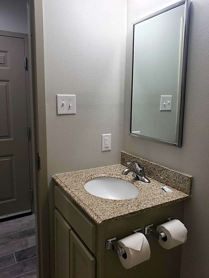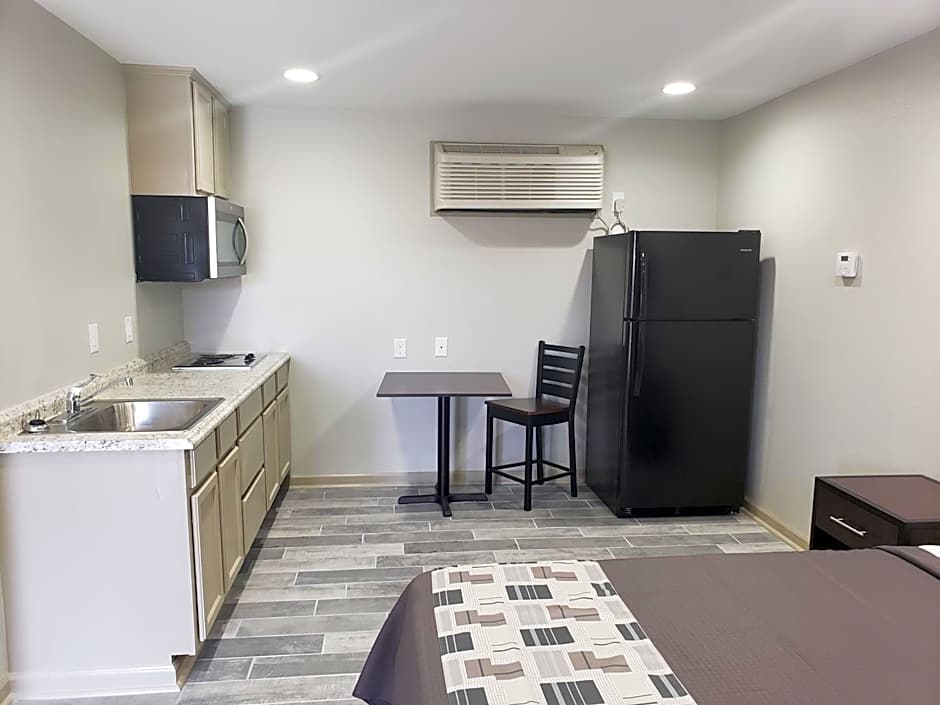 This studio features a stovetop, pots and pans, dining area, microwave, and a 50" LED HD TV.